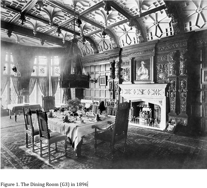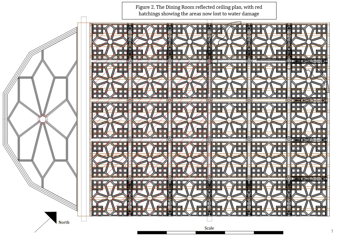 The Dining Room, photographed in 1896 (see Figure 1), has lost a significant portion of its ceiling due to water damage, as shown by the red hatchings in Figure 2. The beauty of the ceiling is shown in Figure 17, it is decorated in a late medieval revivalist style popular at the end of the 19th century, and features panel moulds that drop to form pendants on the flat sections, surrounded by deeper plaster ribs, forming larger square panels decorated with inverted crowns at their junctions—the whole ensemble created from fibrous panels. The Dining Room reflected-ceiling plan (Figure 3) shows the ceiling profile. Around three edges of the ceiling are deep coves, with the larger ribs that subdivide the ceiling, apparently supported by curving lion-headed console brackets bearing heraldic shields.