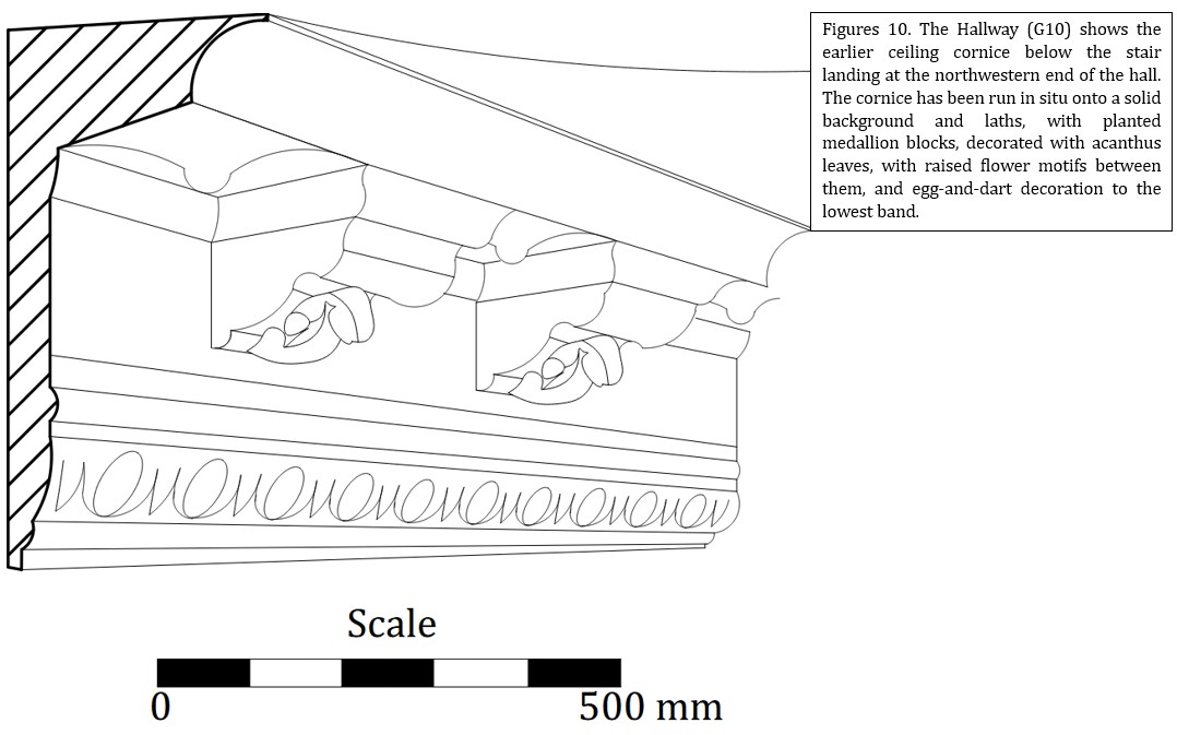 At the northwestern end of the hallway, in G10, the beams are visually supported by fine, fibrous Bacchus-headed console brackets with acanthus leaves below. Beyond them, under the stair landing, is an earlier cornice and lath and plaster ceiling, now all but destroyed by fire and water damage. An earlier ceiling cornice is located below the stair landing at the northwestern end of the hallway (see Figure 10). This cornice has been run in situ onto a solid background and laths, with planted medallion blocks, decorated with acanthus leaves, with raised flower motifs between them, and egg-and-dart decoration to the lowest band.