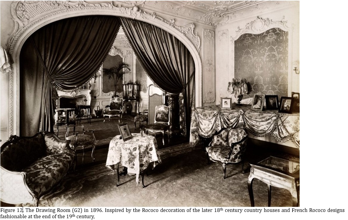The Drawing Room shown in 1896 in Figure 12 is inspired by the Rococo decoration of late-18th-century country houses and by French Rococo designs fashionable at the end of the 19th century. It extends to decorate all the ceiling and wall areas. The lightweight, busy Rococo-designed ceiling, based on naturalistic foliage details, features cartouches decorated with cherubs, overmantels, and framed panels. This is all created from fibrous cast-plaster panels applied to the ceiling and walls. Unfortunately, the fire damage has caused delamination and loss of some upper layers of these panels, and has severely weakened others.