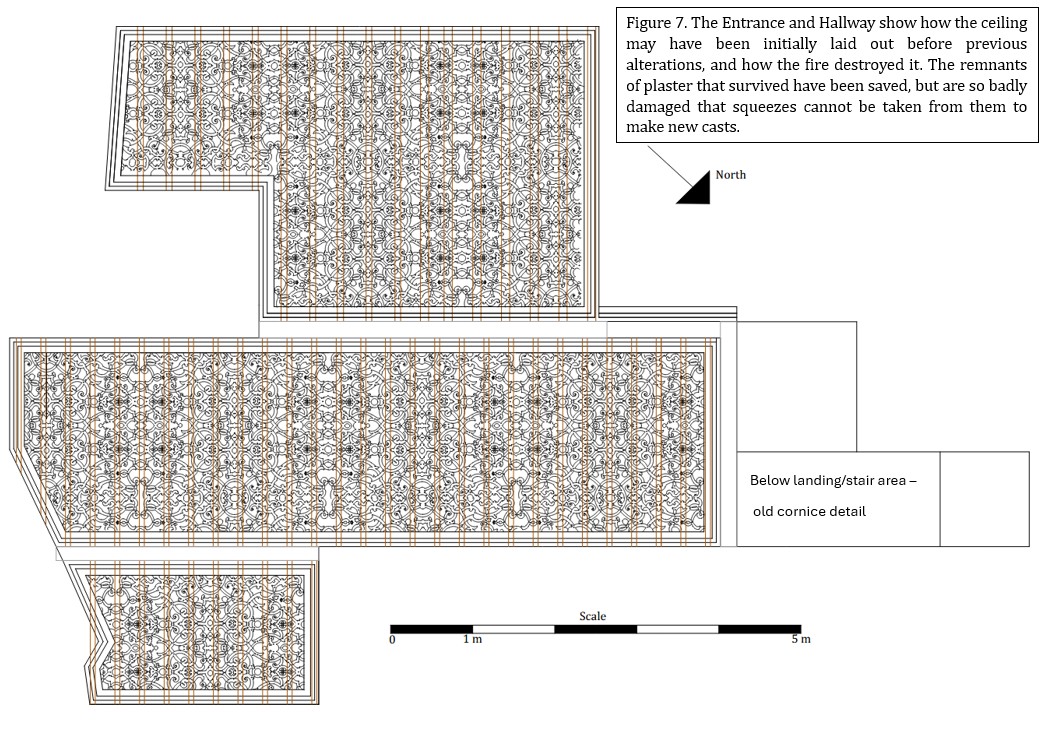 The listed building description states that the hall's late-C19 Jacobean-style relief-strapwork ceiling has been replaced with a plaster ceiling with lighter strapwork decoration. This appears to be based on an old photograph, but the author has not seen it. The lighter strapwork-decorated ceiling, as illustrated in Figure 7, may have existed before previous alterations, but the fire destroyed it. The surviving plaster remnants have been saved, but are so severely damaged that squeezes cannot be taken from them to make new casts. Figure 9. shows the design of the low-relief fibrous-plaster strapwork panels, comprising left- and right-handed single-panel designs, decorated in an aesthetic, medieval-inspired style. This could date from 1896.