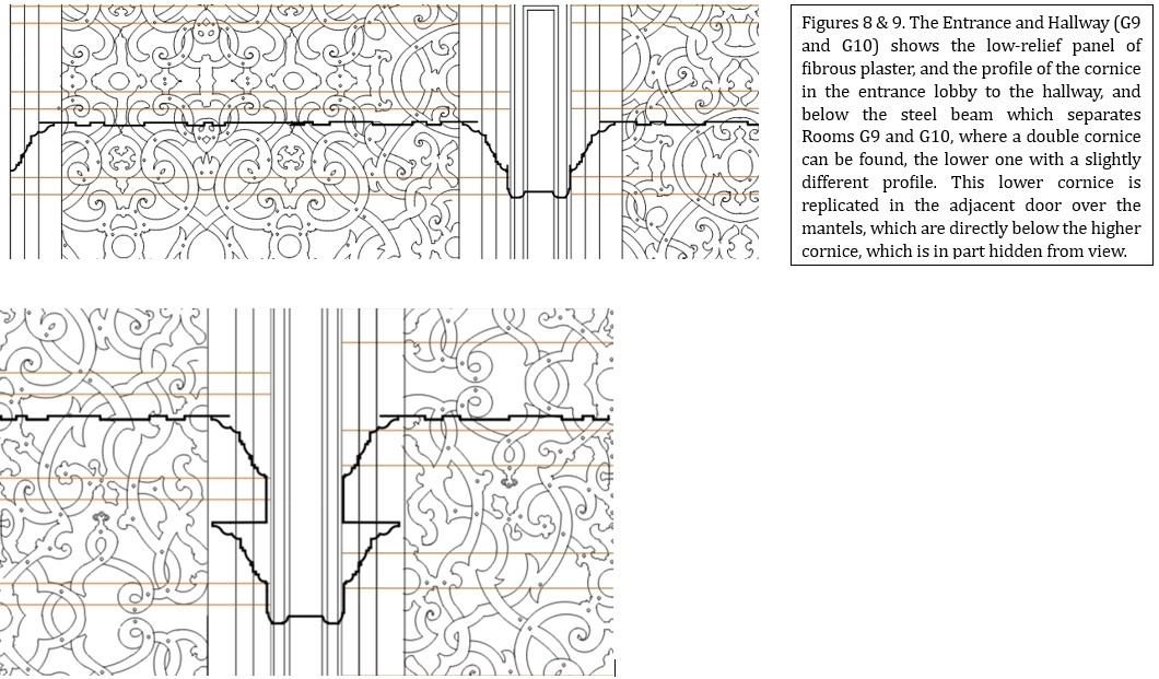 Figures 7 & 8 show the low-relief panel of fibrous plaster, the profile of the cornice in the entrance lobby to the hallway, and, below the steel beam separating Rooms G9 and G10, the profile of the double cornice, the lower one with a slightly different design. Remnants of the double cornice are visible hanging off the wall and the steel beam separating spaces G9 and G10. This lower cornice is replicated in the adjacent door overmantels, which are directly below the higher cornice, which is partially hidden from view. The entrance hall lobby comprises the same lightweight strapwork decorative panels and cornice that run throughout the main hallway—formed of fibrous cast strapwork panels and a simple cornice decorated with egg-and-dart. The inner hallway G9 had lost most of its ceiling to earlier alterations and then to the fire, but also appears to have been decorated with the same strapwork, fibrous casts throughout, and the same cornice detail as found in the main central hallway space.