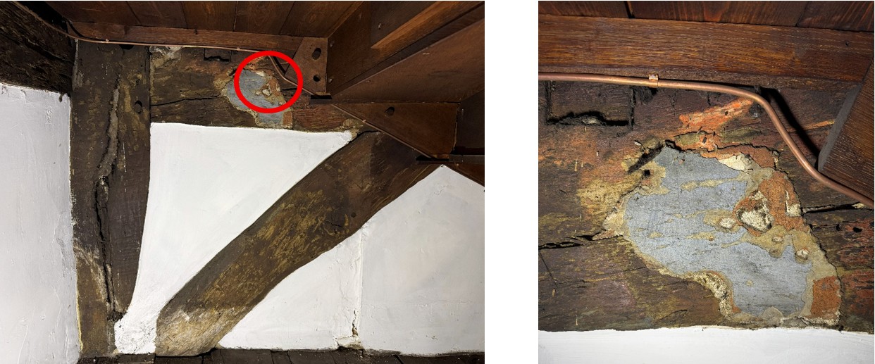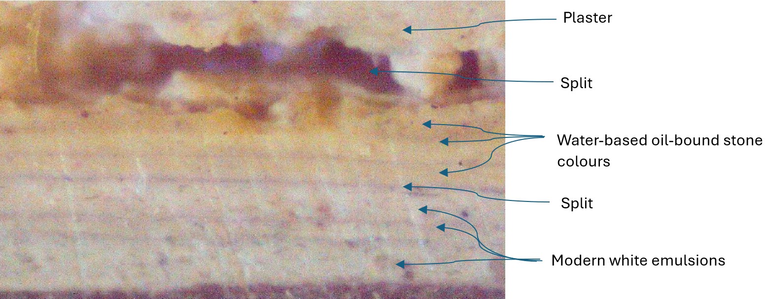 There are a few examples of paintwork that appear to show layers dating from the late 16th century, some behind old layers of paint and lime plaster, which were originally used to decorate lime finishes on clay daubs and onto timber framing. The oldest paint layers are visible in the photographs of samples 4 and 2, with the earliest layers in samples 1 and 3 dating to 1648.