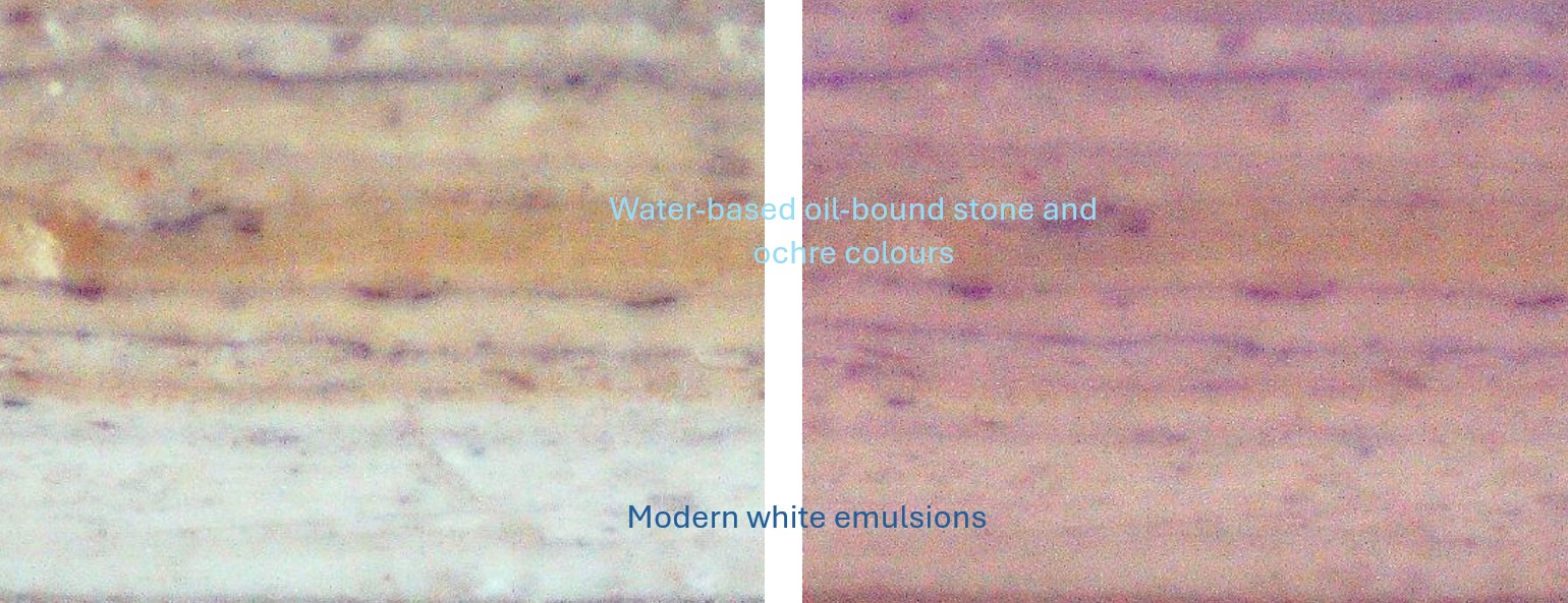 The upper cross-section is at x40 magnification under natural light, and the lower cross-section under ultraviolet light. The oldest paint layers are at the top of each photo.