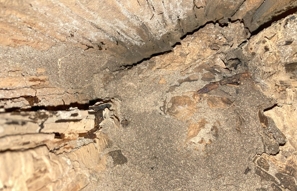The works concentrated on the western column in the tripartite opening that divides the dining room, which had been more extensively eaten by termites than was first thought and which had left it and the arch in a dangerous condition. It was only supported by the four rotten decorative pilaster cover pieces and rotten and incomplete inner boxed surrounds. What was thought to be a damaged area within the central column on completing opening-up works was found to be rotten or missing over its full height. The two fluted pilaster sides and the plainer flanks decorated with planted-on delicate mouldings had also been eaten by termites and required complete replacement.