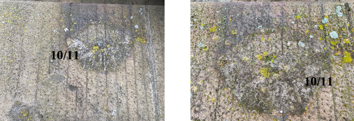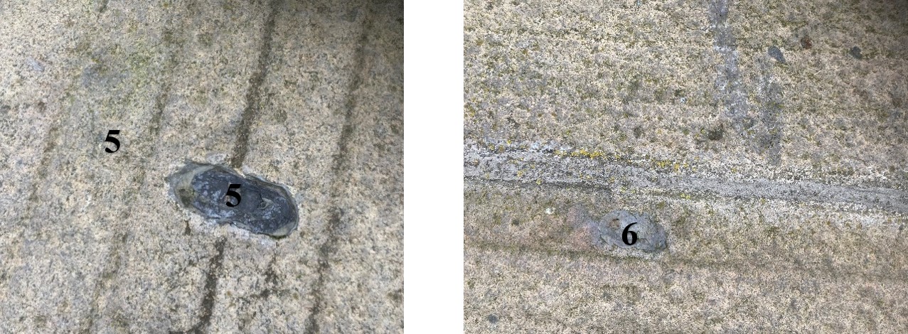 Other distress can be found in the outer slabs, again on the southern half of the building, where previous lifting points, shown as dark blue ovals on diagram 1, have been inappropriately filled with foam, mastic (see Photos 15iii-15vii) or cement mortar that has concentrated decay in the granite surface, see reference numbers 8 and 10/11, as shown on photos 13 and 15. There are also two previously cement-repaired areas to tackle the delamination on the granite surface; see references 9 and 12, shown in photos 14 and 16. Since the last inspection of the slabs in January 2023, the weather has lifted the cement mortar infill to areas 11 and 12. It must be removed and resurfaced with more sympathetic hydraulic lime and Roman Cement Stucco-based stone repair materials. (High-fat lime mortars will damage the silica-rich granite and cause it to suffer excessively from the weather.)
