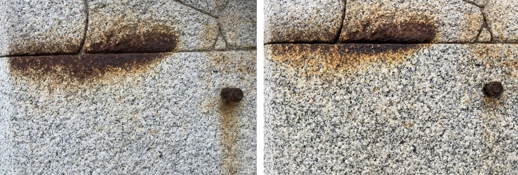 Photos 25i-25iv (Aug. 2024): Damage is caused to the adjacent granite stones by the more recent flat steel bars expanding as they rust.