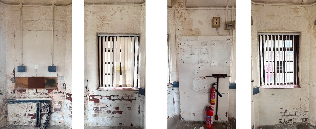 · All the redundant electrical equipment, cables, alarm systems, and conduits must be removed from the hut to carry out the paint stripping. These are shown in photos 69 to 74.