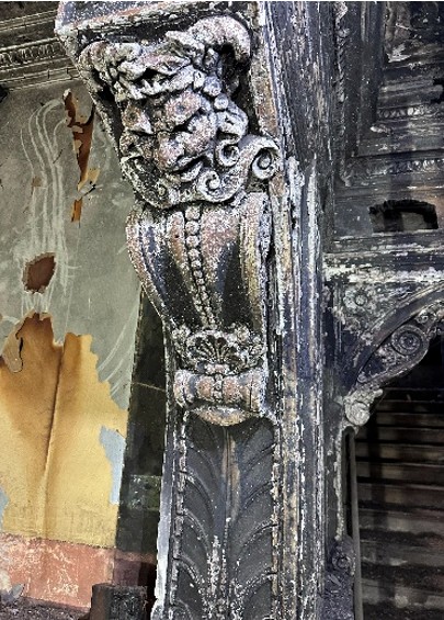 In addition to severe deterioration of the fibrous panels themselves, with rotten hessian and salt-damaged plaster, the nailed supports, wads, and structural timber frameworks supporting them are failing. The arched opening requires cradle supports and fasteners on the back, as it is exposed from above. Similarly, decorative cartouches above fireplaces and decorative wall panels need mechanical fixings installed and wadding to prevent falls.