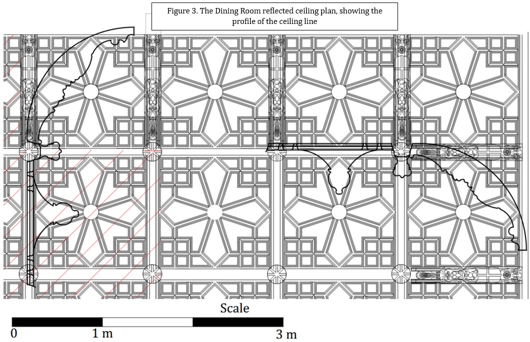 The Dining Room, photographed in 1896 (see Figure 1), has lost a significant portion of its ceiling due to water damage, as shown by the red hatchings in Figure 2. The beauty of the ceiling is shown in Figure 17, it is decorated in a late medieval revivalist style popular at the end of the 19th century, and features panel moulds that drop to form pendants on the flat sections, surrounded by deeper plaster ribs, forming larger square panels decorated with inverted crowns at their junctions—the whole ensemble created from fibrous panels. The Dining Room reflected-ceiling plan (Figure 3) shows the ceiling profile. Around three edges of the ceiling are deep coves, with the larger ribs that subdivide the ceiling, apparently supported by curving lion-headed console brackets bearing heraldic shields.