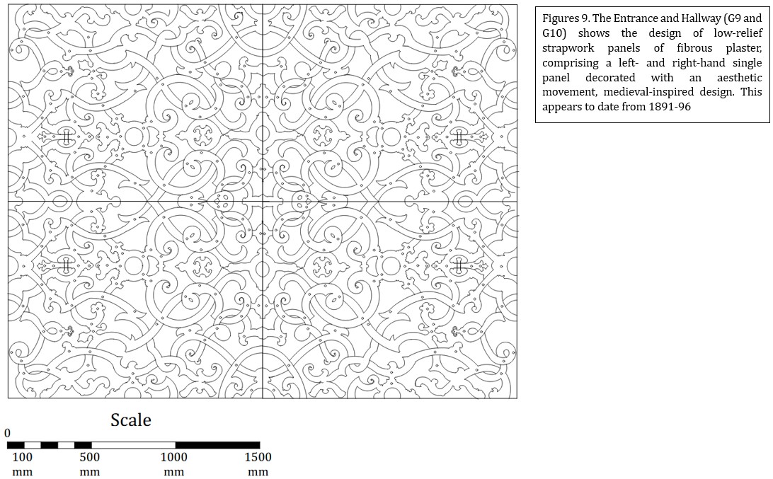 The listed building description states that the hall's late-C19 Jacobean-style relief-strapwork ceiling has been replaced with a plaster ceiling with lighter strapwork decoration. This appears to be based on an old photograph, but the author has not seen it. The lighter strapwork-decorated ceiling, as illustrated in Figure 7, may have existed before previous alterations, but the fire destroyed it. The surviving plaster remnants have been saved, but are so severely damaged that squeezes cannot be taken from them to make new casts. Figure 9. shows the design of the low-relief fibrous-plaster strapwork panels, comprising left- and right-handed single-panel designs, decorated in an aesthetic, medieval-inspired style. This could date from 1896.