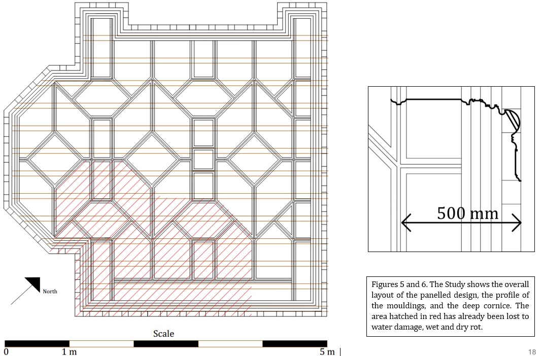The Study is shown as it was in 1891 in Figure 4. The study ceiling is one of the earlier ones in the building, comprised of gypsum gauged lime plaster applied to timber riven laths, with some panel moulding run in situ and other sections run in casting plaster on the bench and fastened to a flat plastered surface. Continuing the theme of applied geometrical patterns formed on the ceilings with panel moulding. Figures 5 and 6 show the overall layout of the panelled design, the profile of the mouldings, and the deep cornice. The area hatched in red has already been lost to water damage, wet and dry rot. The whole ceiling-supporting timber structure and the laths have been ravaged by rot and dry rot. Fruiting bodies, together with a great multitude of mycelia, are visible.