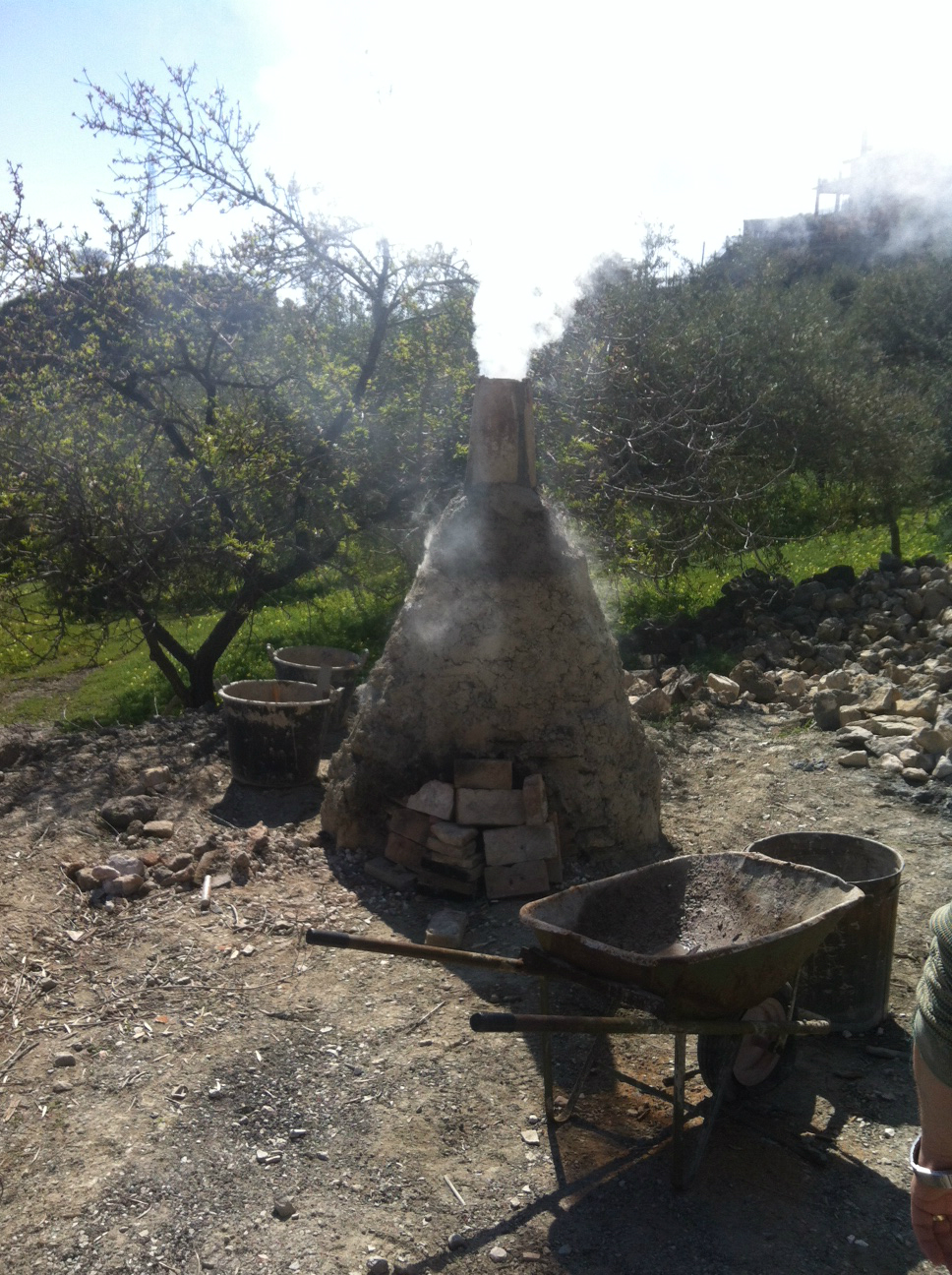 The Kiln was simply circular on plan tapering to a chimney at its apex. A brick arch was constructed at its base. Before the final few courses where built the kiln was loaded with twigs and small branches taken from a pile of olive branches that had been created by pruning the year before. Larger Olive wood was then cut up and loaded in, before a layer of larger limestone was laid on top. Smaller stones where then put in, before more wood and stone. The Construction of the kiln was finished and a chimney was created by standing three semi-circular roof tiles upright. To ensure the kiln was insulated and that enough of a draw was created without leakage of air the whole thing was rendered with a clay mortar, harled onto the coarse limestone blocks.