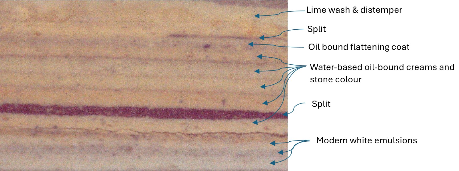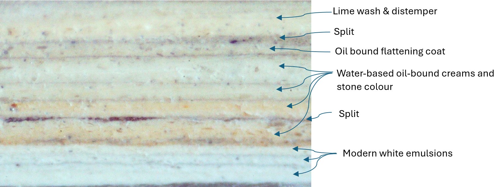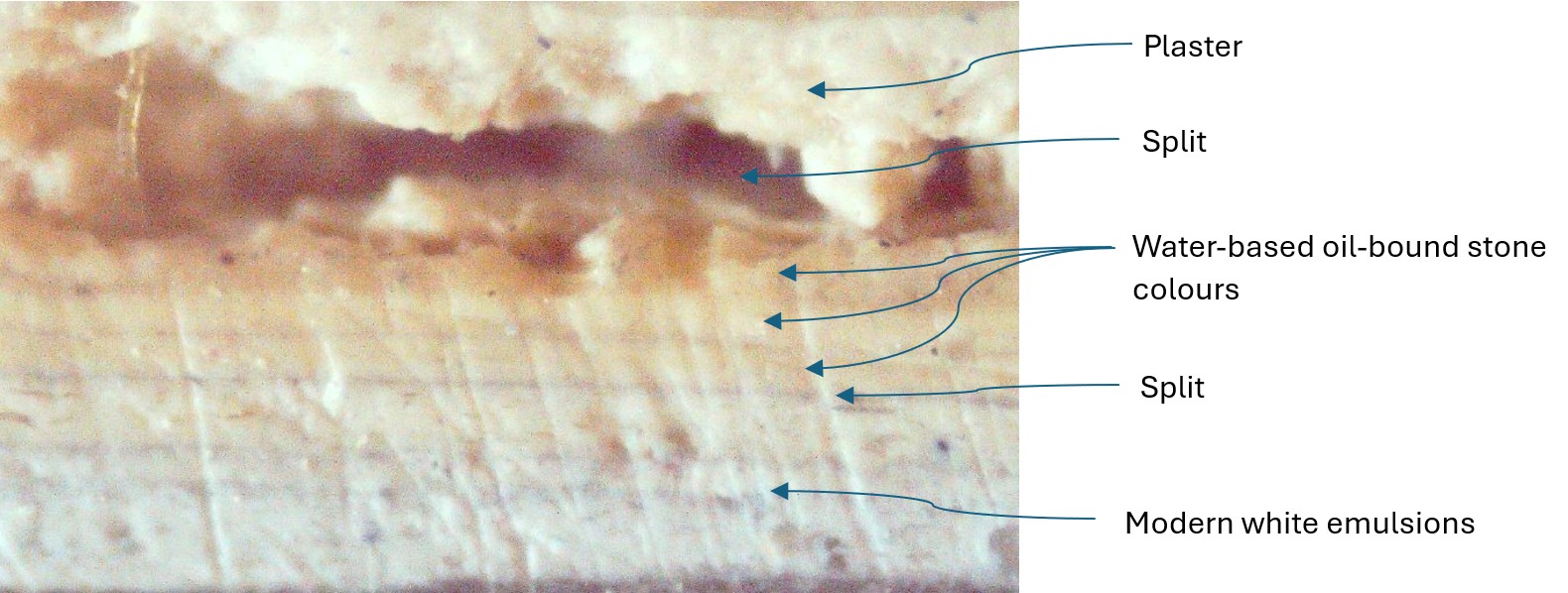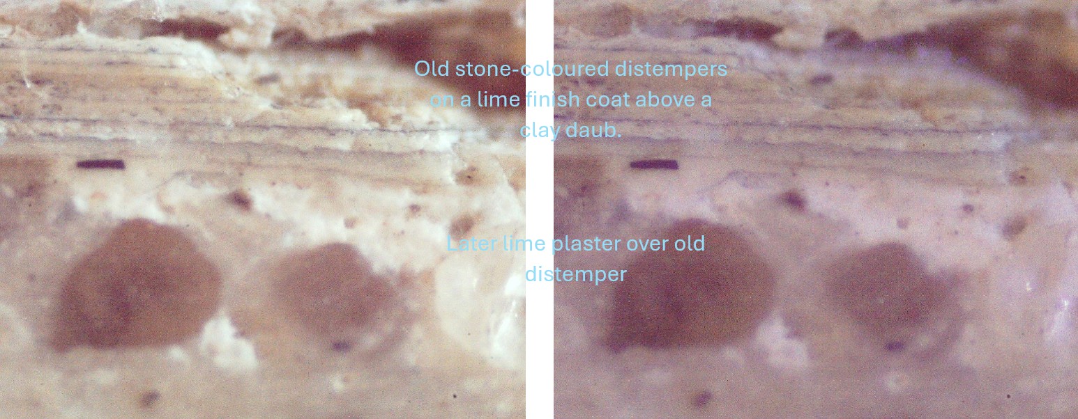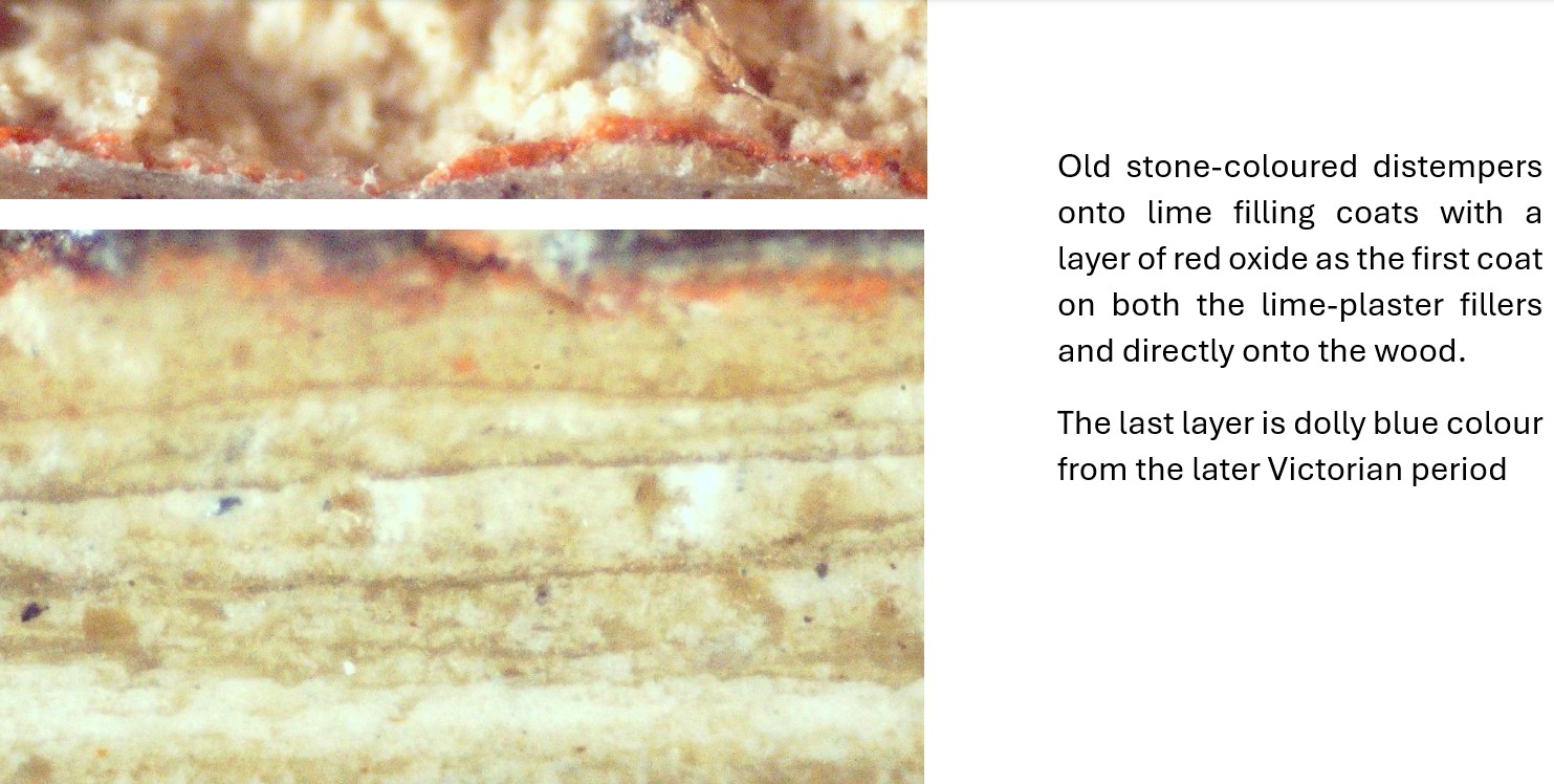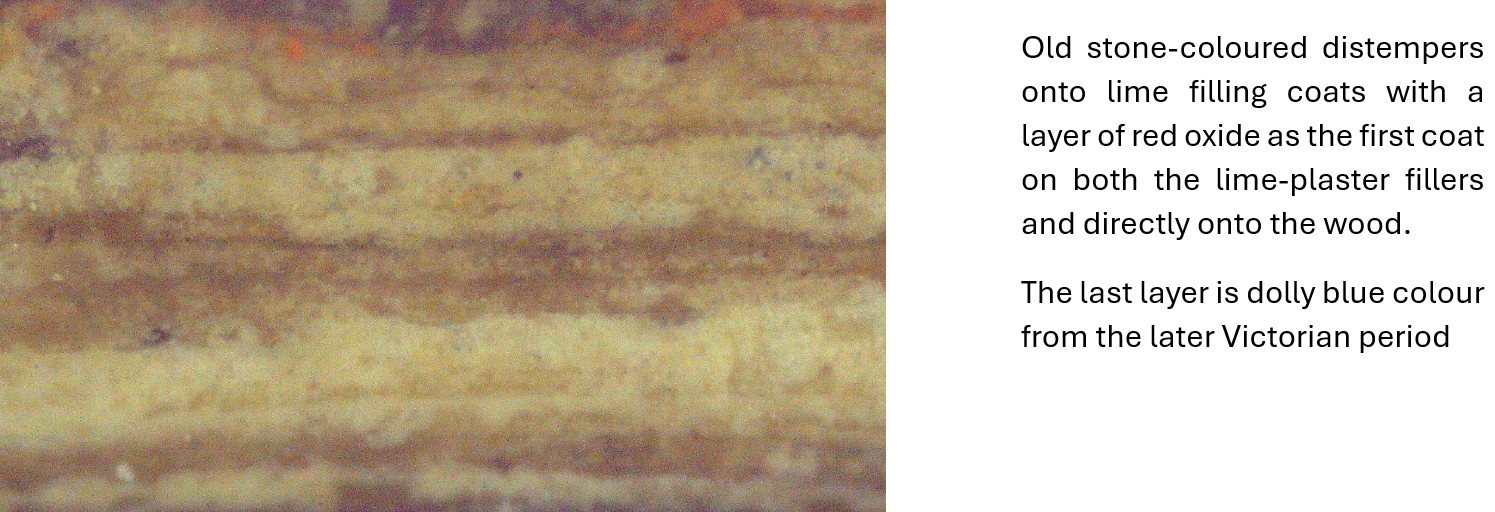 There are a few examples of paintwork that appear to show layers dating from the late 16th century, some behind old layers of paint and lime plaster, which were originally used to decorate lime finishes on clay daubs and onto timber framing. The oldest paint layers are visible in the photographs of samples 4 and 2, with the earliest layers in samples 1 and 3 dating to 1648.