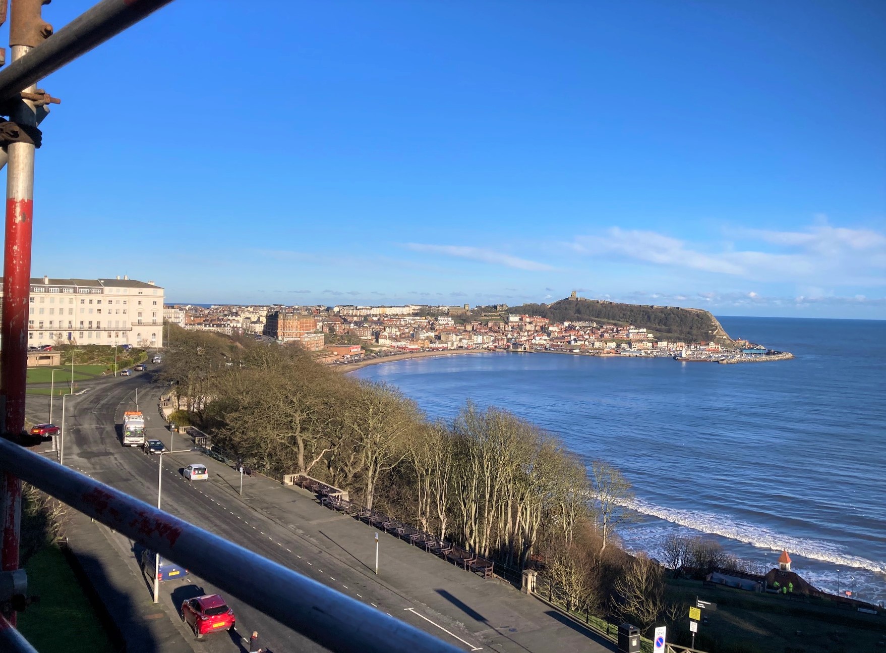 A very cold day – 4 to + 4 degrees centigrade, working on top of the scaffold, but great views over Scarborough’s South Bay.